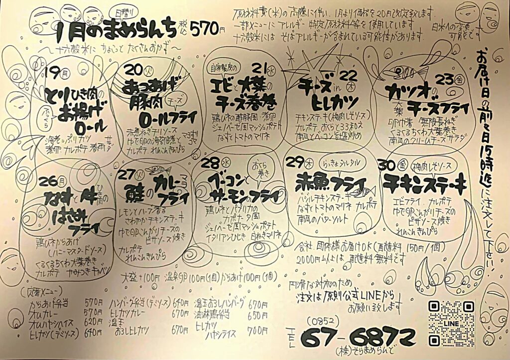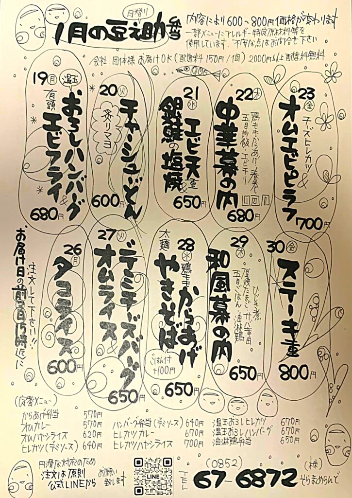 ☃1月後半そらまめし❄ BLOG Tweet 2026 01. 12 BLOGNEWS おはようございます🌞そらまめらんどです! 週末は雪と風がすごかったですね💦積もらなくてよかったです(´;ω;`)✨ 今日は成人式ですね👏新成人の皆様おめでとうございます㊗㊗ さて、遅くなりましたが1月後半の日替わり弁当メニューをアップいたします🐎✨ 新メニューも登場しておりますのでお楽しみに☺♡