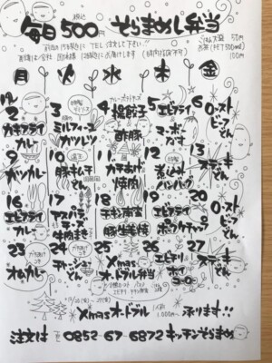 800円~2000円でオーダー弁当も可能です。 運動会やクリスマス会などにオードブルもご好評いただいています。